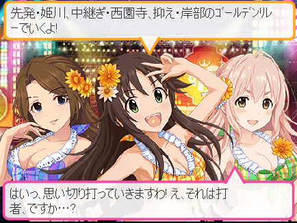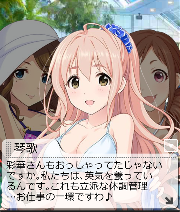サマーシーズンだけどね、ガシャR枠のユニットの一つで、みちるちゃん含めて特訓後は同じ水着になるカードなんだけど、3ヶ月後に秋ガシャで聖ちゃんが同じデザインの衣装もらってたりするんですよね。 4人での劇場もあるし、ガシャSRが少ない琴歌には貴重な思い出エピソードコミュ対応カードでもある
