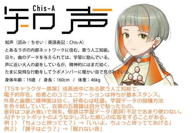 CeVIO Pro(仮)の知声(ちせい)の何が面白いかって、このプロフィールである。特にオレンジ色の文面。