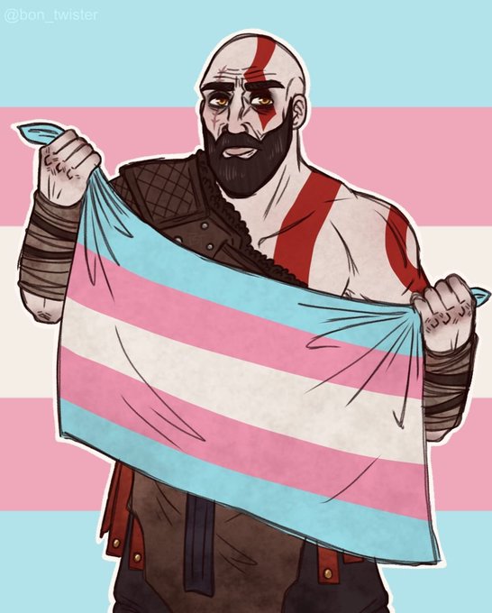 Kratos sosteniendo las banderas #LGBT, #Bisexual y #Trans.