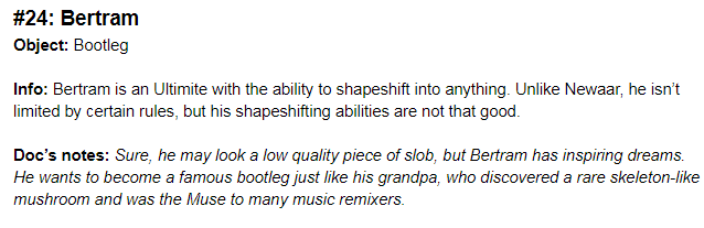 Bertram is an Ultimite of bootlegs. He has the ability to shapeshift into anyone, and unlike Newaar isn't limited by a set of rules. However his impersonating skills... could use some work...