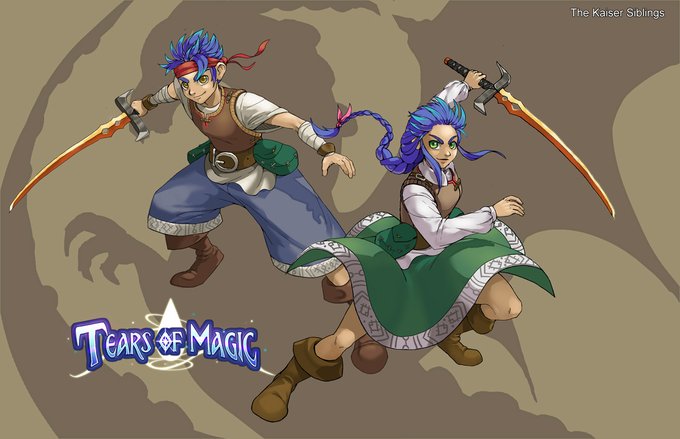 These are the protagonists of Tears of Magic. You can choose Kaiser to be male or female, and the sibling becomes Kai (a few years younger). Not a gender swap, but different people. Which one is your favorite?