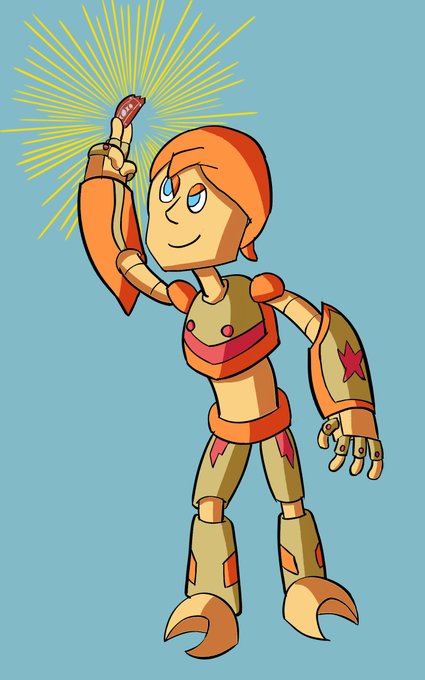 @HaleyJean_Tho His name is Buster! His core is made out of a very rare mineral that almost doesn't exist on his planet anymore, which gives him the power to release explosions from his forearms, and a few other things too!