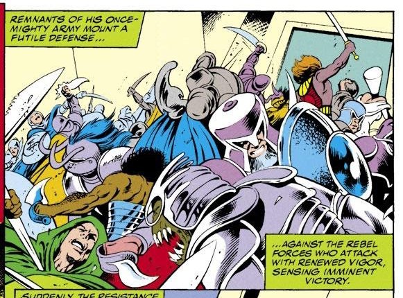 Panel 121: Wolvy-Spider-Man! Thor! Black Knight! Yeoman UK! Forget our FF, the Excalibur of Earth-148 is the true fantastic four (who, sadly, don’t make it past the next issue)! And what a tease to end this issue on…! -@XMen90sCovers