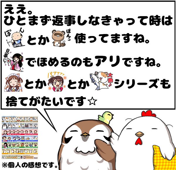"スズメのお宿 スタンプ"で検索すると出てくるよ♪更新は遅め。。。