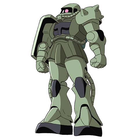 《MS-06F ザクⅡ》ジオン公国軍の汎用量産型MS。ザクⅠの実働データに基づく改良を経て完成した後継機であり、様々な兵装の装備を可能とする高い汎用性を有している。一年戦争の緒戦から終戦まで戦線を支え、なかでも宇宙用の標準機種となったF型は3000機以上生産された。