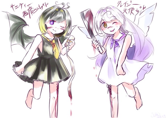 血注意 これが割と最近ざっくりだけど描いたクレイジー天使ちゃんとサニティー悪魔ちゃん 初期案みたいな感じ