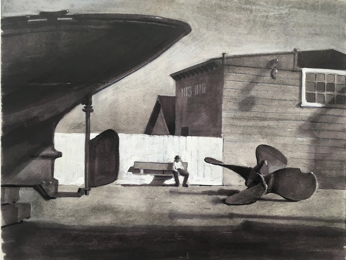 I sit out back between a rusty engine and a forklift. The rain streams off the corrugated roof and splashes into the water, forming bubbles and reflections. I use watercolor pencils, scratching the white vertical lines with a mat knife. #urbansketchers #rainyday #mudpuddle