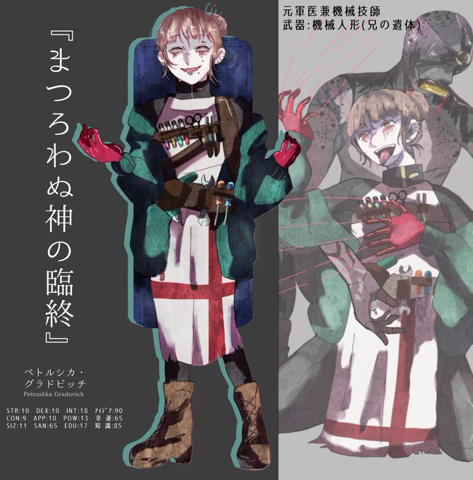 19日参加する「まつろわぬ神の臨終」の自PC立ち絵できた🥳 お兄ちゃん大好き元軍医の機械技師です ピアスは兄の遺骨でできてる