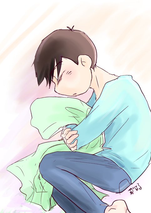 緑のパーカーを抱きしめて丸くなって眠るカラ松