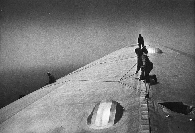 パズーがタイガーモス号の外で修理を行う描写ですが実際の飛行船でもこうした作業は行われました。 1929年に日本に来航したLZ127グラーフツェッペリンも大西洋横断飛行中に破損した左尾翼の修理を洋上で行なっています。 飛行に支障はない破損でしたが念の為に応急修理を行ったそうで(続 #ラピュタ