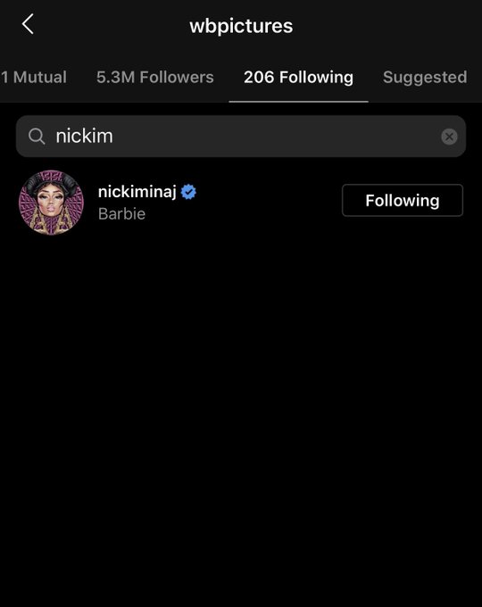 The official Warner Bro’s Instagram account has followed Nicki Minaj. 👀 🎬