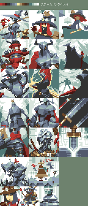 ドット絵アプリ「ドットピクト!」にて作画したドット絵のパレットごと画像まとめその壱。 プリセットのパレットで一番使用頻度が高いのがスチームパンクパレット。100枚中29枚作画 #dotpict #pixelart