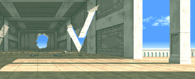 昔担当させてもらったドット絵背景の一部。アニメビデオの資料見て仕様にあわせて線画(パースもあわせて)をドット絵で描いて彩色という流れ。線画を紙上で描いて取り込みという工程を省略。16x16ドットごとに16色づつパレット管理しつつ作画(文字だとわかりにくい)