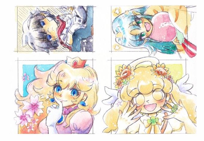 アナログ水彩イラスト 左上から時計回りに、 メイプルストーリーよりクロウ 桃太郎伝説シリーズより夜叉姫 ポップンミュージックよりポエット マリオシリーズよりピーチ姫 紙:ウォーターフォード水彩紙中目