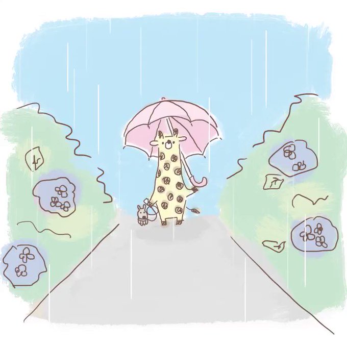 昔作ったアニメーションに効果音追加してみました。 雨の音が好きです🦒🐶☔ #イラスト #キリン #ワンコ