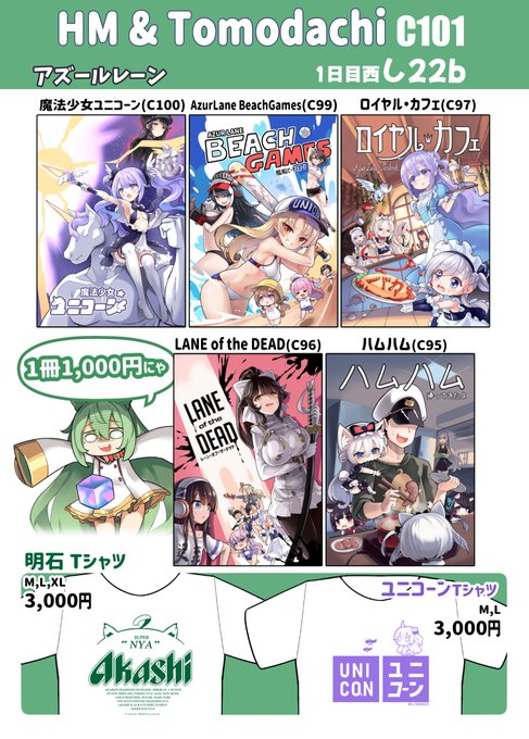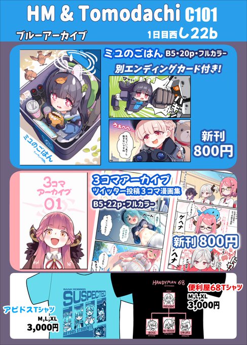 C101のお品書きです 今回はこの2つ ブルーアーカイブ新刊2冊「3コマカラー漫画20ページ」と「Tシャツ2デザイン」 アズールレーン本とTシャツも揃ってます C101 1日目西し22bにて ぜひ遊びに来てね #C101 #ブルアカ #アズールレーン