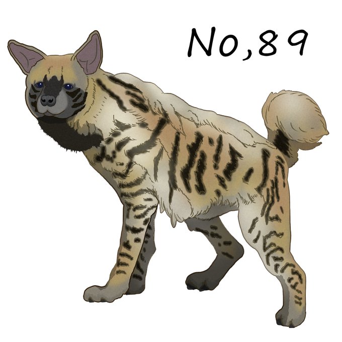 #シマハイエナ (No.89) 縞模様のハイエナ。過去絵のブチハイエナと比べるとずいぶん印象が異なる。日本ではブチのほうが多い。ハイエナの仲間は生態も見た目も独特なので、いつかカッショクハイエナやアードウルフも見て描きたい。