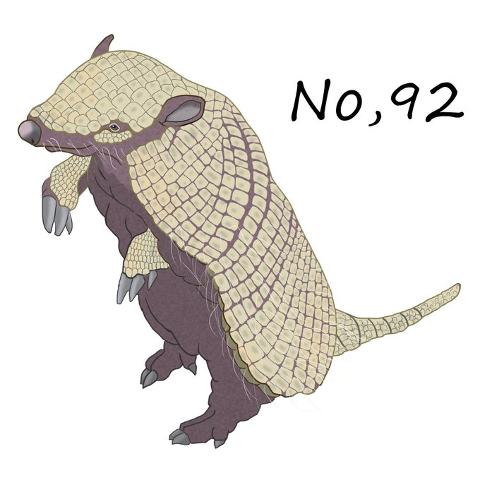 #ムツオビアルマジロ (No.92) 再掲載。ボール状に丸まった姿が有名なアルマジロ。…けれどムツオビはボールにはなれない。うろこ状の背中が過去一番で時間のかかったイラスト。大変だったけど愛嬌ある顔&ポーズはお気に入り。