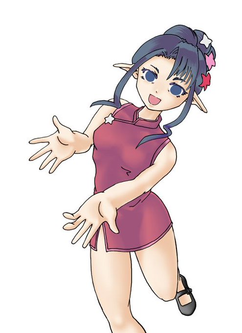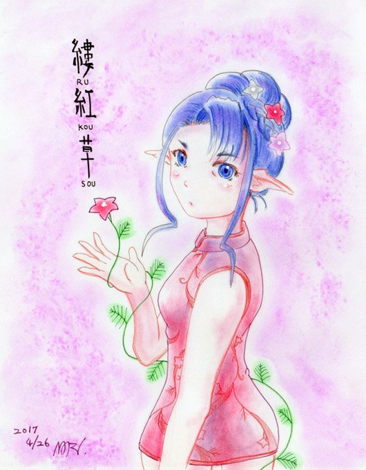 ルコウソウちゃん絵の続き🌺 チャイナ服の柄にもう少しルコウソウ感を出したいと、模様にアクセントとしてあの「可愛くない葉っぱ」を描き入れましたw 他、髪飾りの三色のお花は実際の花同様、つぶつぶ花粉も再現♪ とはいえTwitterでアップで縮小されるので分からなくなりますね(笑)