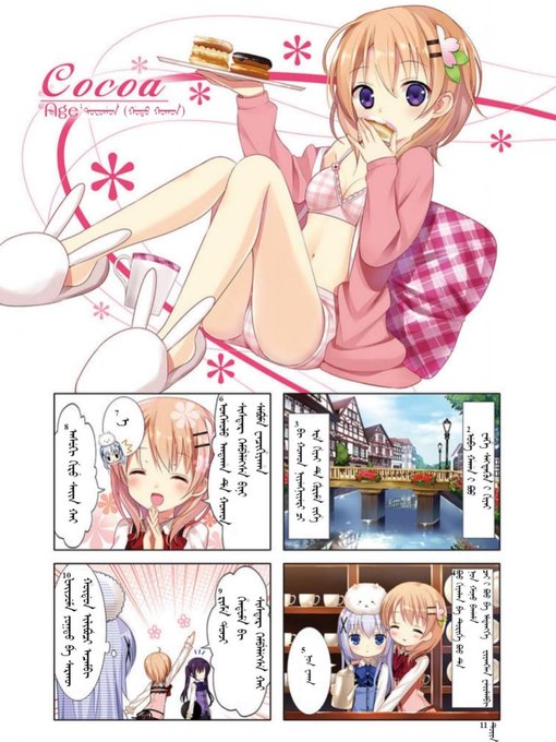 『ご注文はうさぎですか?』の満洲語版、何故かまだ出版されていなかったので、試しに少しだけ作ってみました。まだ語彙の検討も終わっておらず、またペイントクオリティなので、満洲語母語話者の方々に怒られそうですが。