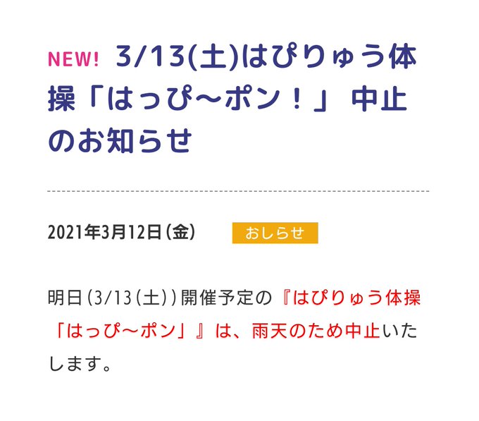 エンゼルランドふくいで開催中の児童館フェスタ2021において、明日3/13(土)に実施を予定していた『はぴりゅう体操「はっぴ〜ポン!」』は雨天が予想されるため中止となりました。※はぴりゅうの活動も行いません。