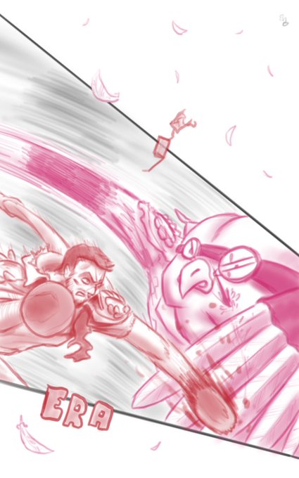 Este intercambio deriva en un potente ataque de @geekfurioso que @MGolondrinart apenas puede desviar, dando,e mayor potencia visual con una viñeta deformada en la dirección del ataque.