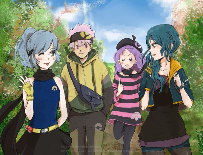 This illustration is now one of my fave drawings all time, BECAUSE the characters here (f.l.t.r. Aki, R.J, Amy, Hope/ @TZxSayumi , @HasumiKasumi , @SweetSilverSwan , @Oblituslucis )  are our Pokemon OCs! We are “Poke-family  B.O.S.S.” Hope you like it too ;w;