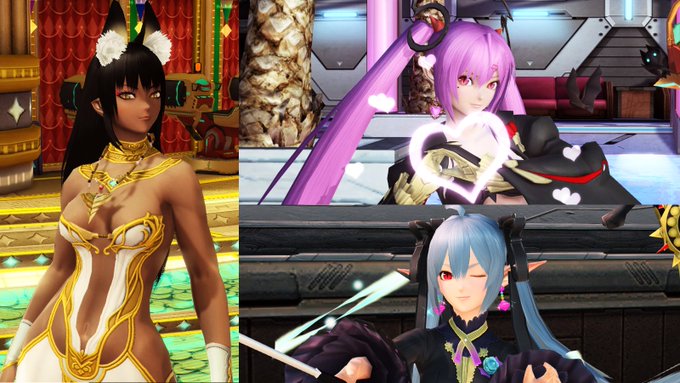 うちのちびっ子アガリアと、小悪魔エンプーサ、そしてアヌビス!キャラの特徴をとらえたかわいいデフォルメで頬が緩みっぱなしでした!4枚目は実際のpso2での3キャラ。 #pso2