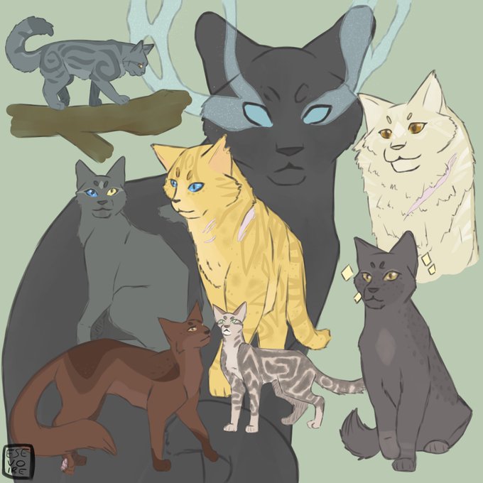 light grey with green eyes is icepaw, white chin is rookpaw, fluffy boy laying down is falconpaw. they were brought in as rogues with their father, seeking refuge 💫