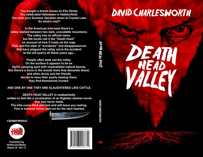 The Cover Art for David Charlesworth's "Death Head Valley" published by Hellbound Media this May, our first prose release. Written as if it were a novelisation of a 80s #slasher #film, this is a gore #extremehorror novella. Designed by David Davies @FTShadows ! #horror #DHV