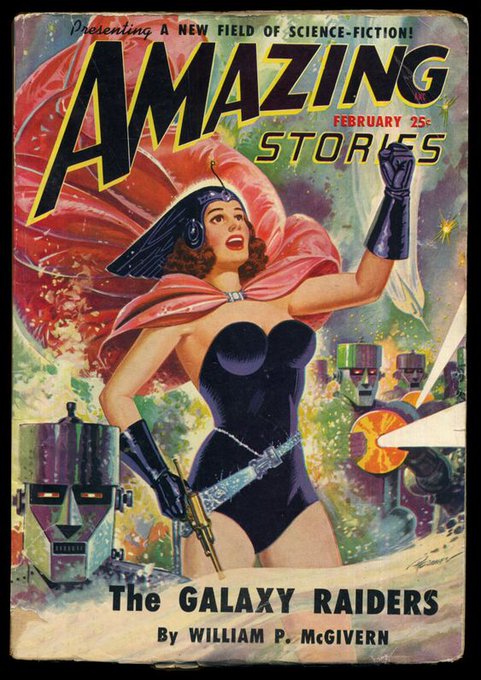 #SciFiDaily goes pulp with this 1950 Amazing cover. I couldn't discover the artist's name, but the cover composition—with muted colors, no specific scene, and story elements surrounding a central character—is decades ahead of its time. It's a truly beautiful cover.
