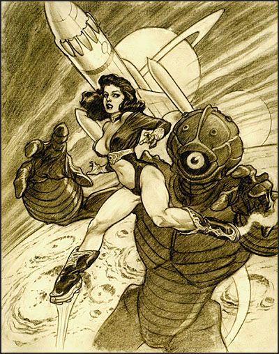 #SciFiDaily thinks Mark Schultz's Pulp Siren chose style over function for her rocket boots. Hint: the designer should have an engineering background rather than fashion, because you never know when you'll need them to escape from an alien cyclops. Great pulp adventure setup, tho