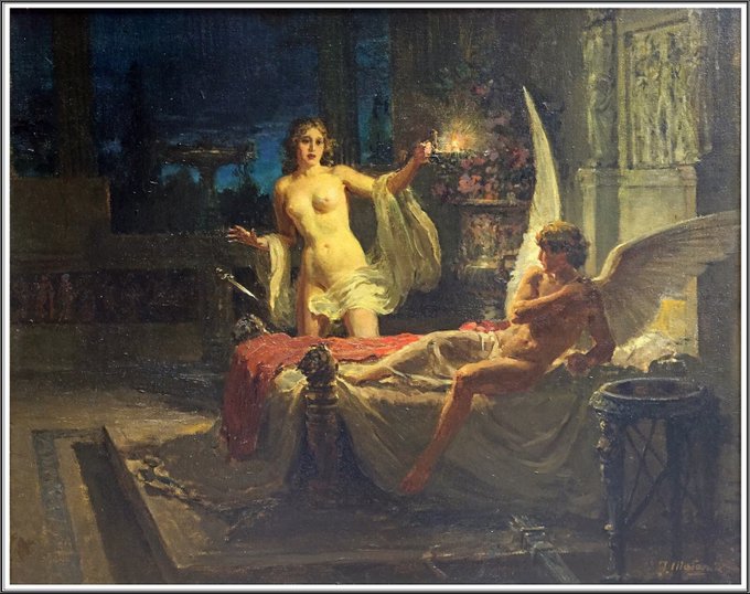 Stupéfaite par la beauté d’Éros, elle le brûle avec l’huile de sa lampe, et celui-ci, furieux, s’envole.