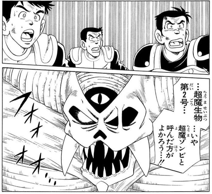 The giant, horned, saber-toothed, one-eyed Superior Zombie bears a passing resemblance to the Special Zombie Oars from One Piece, which of course came way, way later. Was Dai another influence on Oda, along with DB and Kinnikuman?