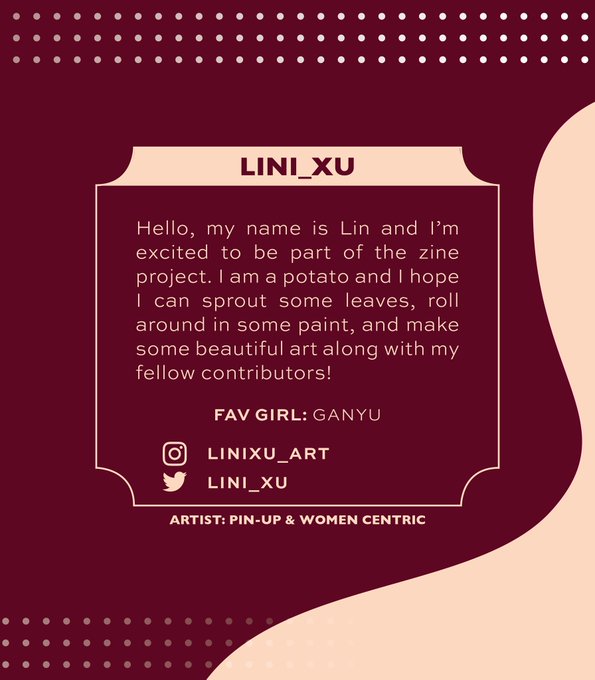 Our page artist ✨ @Lini_xu ✨ says that she is a potato and hopes she can sprout some leaves, roll around in some paint, and make some beautiful art along the way with the fellow contributors!