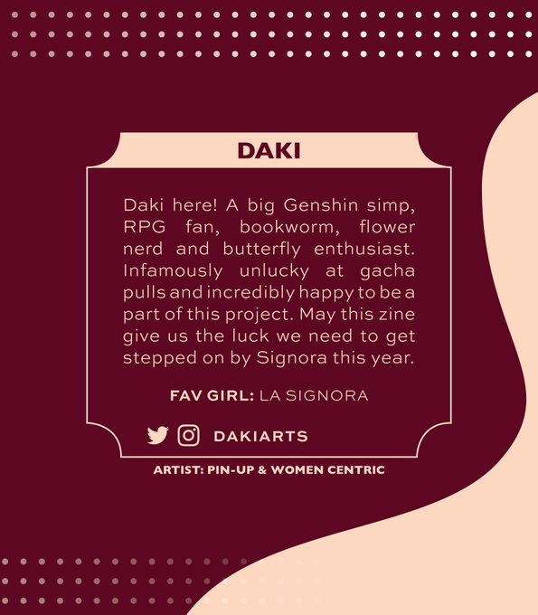 Our page artist, ✨@Dakiarts✨, confesses to being "a big Genshin simp, RPG fan, bookworm, flower nerd and butterfly enthusiast." She wishes that this zine gives us the luck we need to get stepped on by Signora this year. Thank you, Daki.