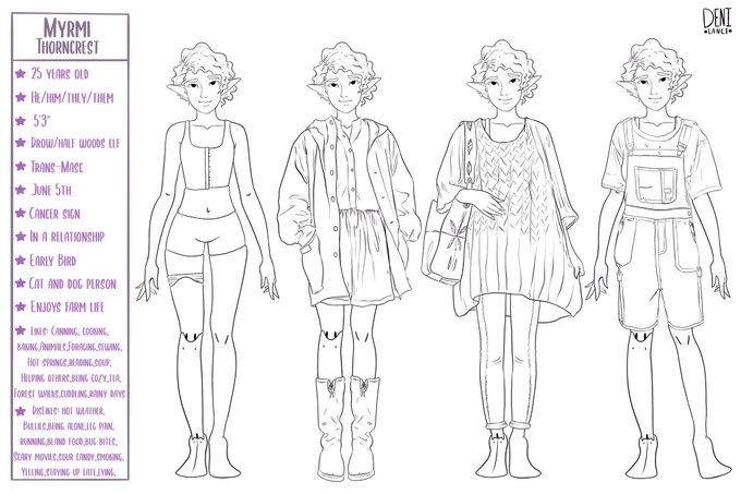 @C_LeaDraw My sweet boy Myrmi, my half Drow half elf dnd character. He loves to garden, bake and spend time with his cute boyfriends (yes it’s a polycule) pronouns are he/him/they/them! I would love to see Myrmi in your adorable style!