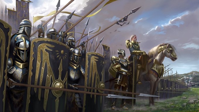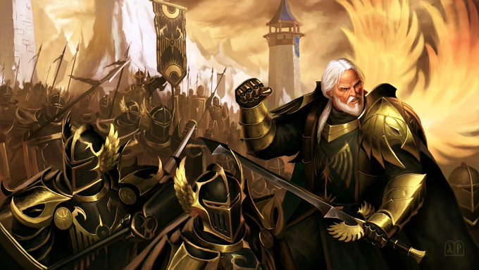 @Sunreign I’ve shown you this a bit before but this is Highlord Raseri! An old Knight leading a battle trained legion of zealous warriors. He’s fiercely protective of people and always tries to do what’s right but is old fashioned and struggles to know what that is sometimes