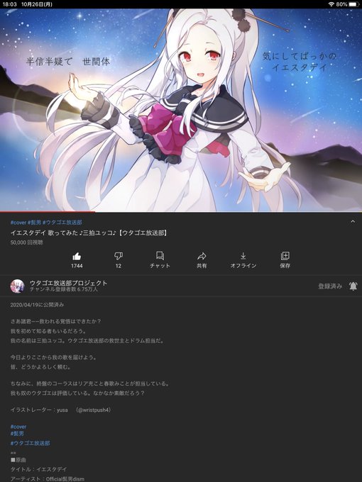 5万回のイエスタデイおめでとうございます!🎉🎉🎉 心が浄化されるようなウタゴエが素敵です✨ 自分はこの歌みたがきっかけで積極的にウタ部を応援し始めたので、ほんとに感謝しています🙏 リア充コーラスも好きです😎 またいつか歌ってくださいね!! #ウタゴエ放送部 #三拍ユッコ