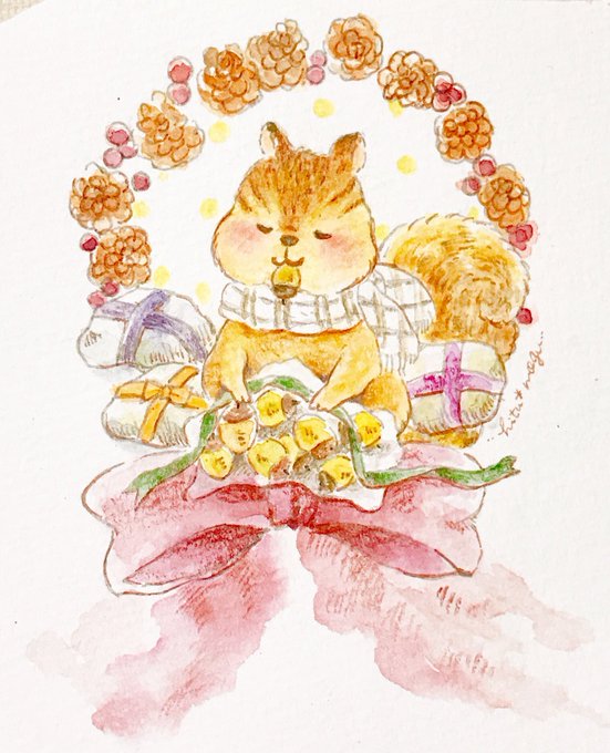 🍀おつつみいたします🍀 🎁🐿✨ ・・・・・・・・・ みーちゃんとのお絵描き会にて🖌✨ 最近ラッピングラッシュだったので ついこんな絵になりました🎀 そのままラッピングシールあたりに使おうかなぁと思います🎁^^* #イラスト #リス #絵本