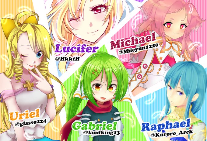 5人で合作しました! ありがとうございます!! みんな素敵な絵をありがとう♥ 一生の思い出です(^▽^)/ ウリエル @glass0224 ガブリエル @landking13 ミカエル @Miicyun1220 ラファエル @Kuroro_Arck ルシファー とろ山葵
