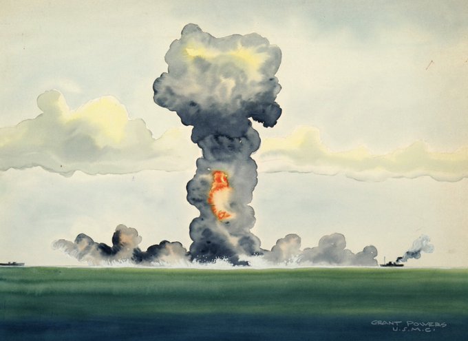 (2/2) The tests were to study the effects of nuclear weapons on warships, equipment & material. (When I learned of this assignment, I figured Powers would have died soon after from radiation exposure, but he died in the 1970s.) These are some of Powers’ paintings from the tests.