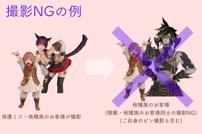 #保護ミコハウス 他種族のお客様のSSの取り扱い方がイマイチ分かりにくいとのお声を頂きましたので、簡単に図解してみました。 「あくまでミコッテがメイン」ということを念頭に置いていただければ、そこまで厳しく取り締まってはおりません🐈🐾 よろしければご確認ください🌸 #FF14 #ミコッテ