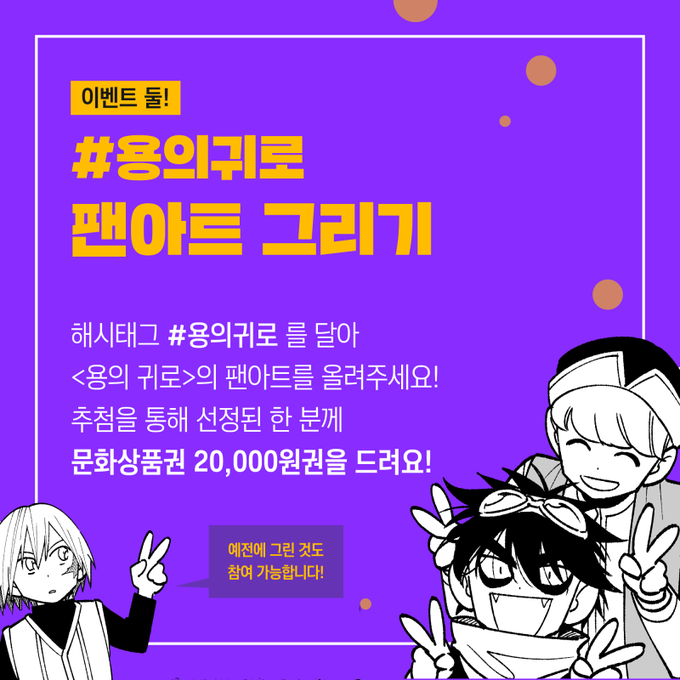 8월 16일까지 #용의귀로 해시태그와 함께 감상문이나 팬아트를 올려주신 각각 한 분께 문화상품권을 드려요! 보너스로 캡쳐 이벤트도 있으니 많이 참여해주세요!