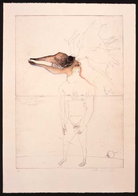 A selection of hand-colored etchings and a sculpture by Alan E. Cober (difficult to find titles for these, the 2 heads are photos I took of prints in a Cober collection a coworker showed me)