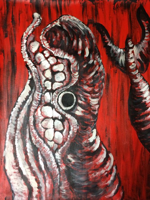 “ある時、ここはどこだと同じ所をグルグルと ある時、知らない路地裏で迷いに迷い ある時、何度も見かけた腹を空かした野良犬に出口はここだと左手を噛みつかれ ある時、私はそこで目を覚まし窓の外に見える赤い空は夕方なのか?朝なのか? ある時、ここは野良犬の腹の中” #art #詩 #アート #絵