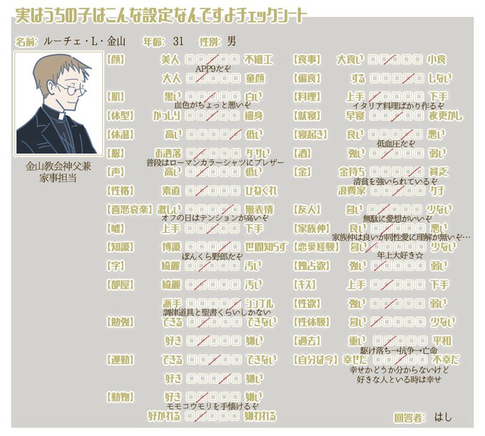 @PCS_TL チェックシートだよ すーちゃん/よなよなファミリー(マフィア)、ももちゃん/千代見会(ヤクザ)、アンリ/ヒモ、ルーチェ/エセ神父