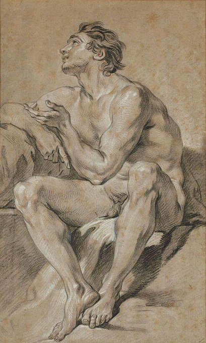 François Boucher.1703-1770. Academy of a Seated Man Representing Mars. Black and white chalk,sanguine.