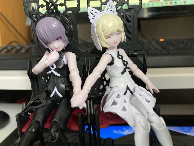 チトセリウムより、 XCIX アルベラちゃんとC エフェルちゃん。 可愛い双子で黒がテーマで落ち着いた印象のアルベラちゃん、白がテーマで明るく元気なエフェルちゃんのセット。 まず箱絵が素晴らしく可愛く綺麗。そしてお人形のように愛らしい造形は芸術域に達している。 繋ぎ手も色々遊べていい。