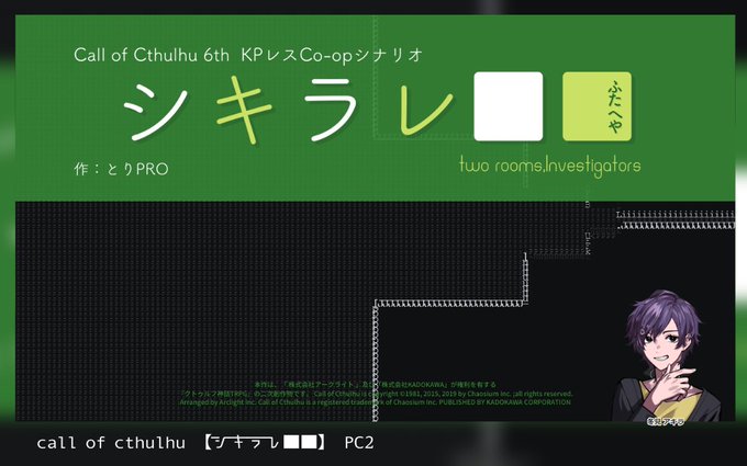 CoC『シキラレ■■』(とりPRO様) KPレス PL:ながれさん、重諭さん、トトリ_シナオカ PC1:蔡家デリック、ニャオ PC2:冬見アキラ 生還END!今度はアキラくんと一緒にデリックさんのところにバイトに行こう!!お二人ともありがとうございました~~!!